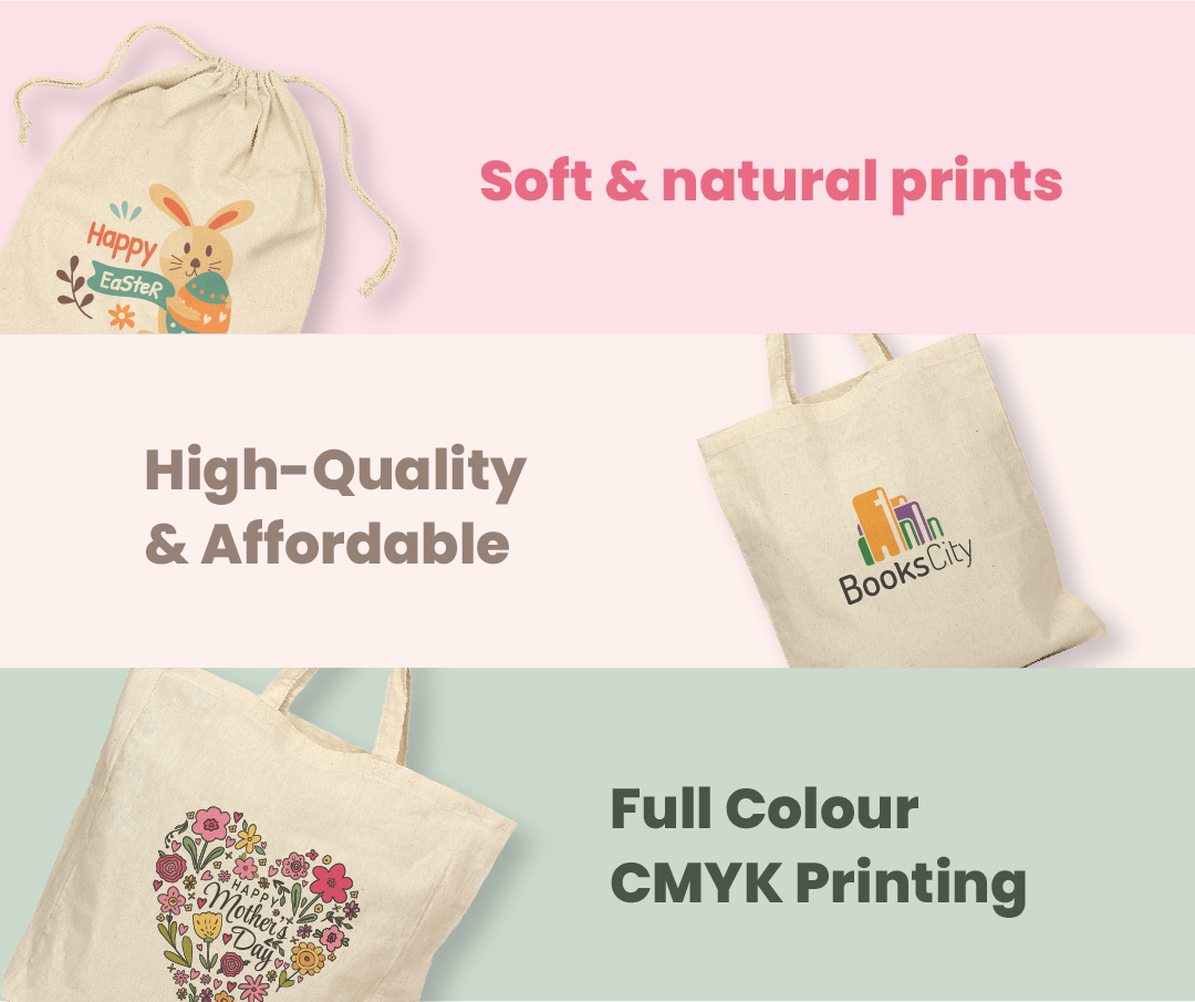 If you need a more vibrant print, choose DTF, or if you want a custom quote on screen printed calico bags, let us know!