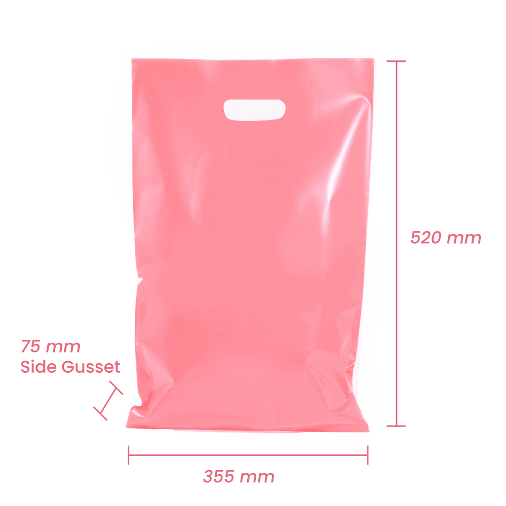 100 x Glossy Coral Pink Plastic carry bags with die cut out handle. This size is great to fit items that are big and bulky in size, having a big side gusset means the bags can open up much deeper to fit more inside!