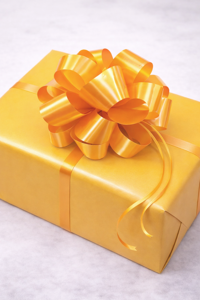 4. Use the extra strands of thin ribbon to wrap around your present, cut them or curl if desired! Fluff and move around the loops to get the perfect full bow!