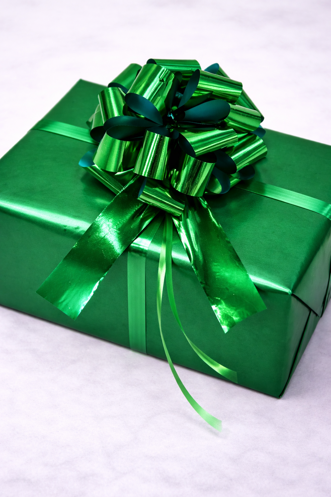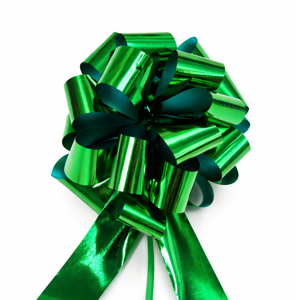 12 x Metallic Emerald Pom Pom bows on a roll. Each finished bow is approximately 13.5cm diameter with 24 loops. Ribbon width is 30mm. Make your decorations and gifts look big and full of life with these great bows! Plus they are so easy and fun to make!