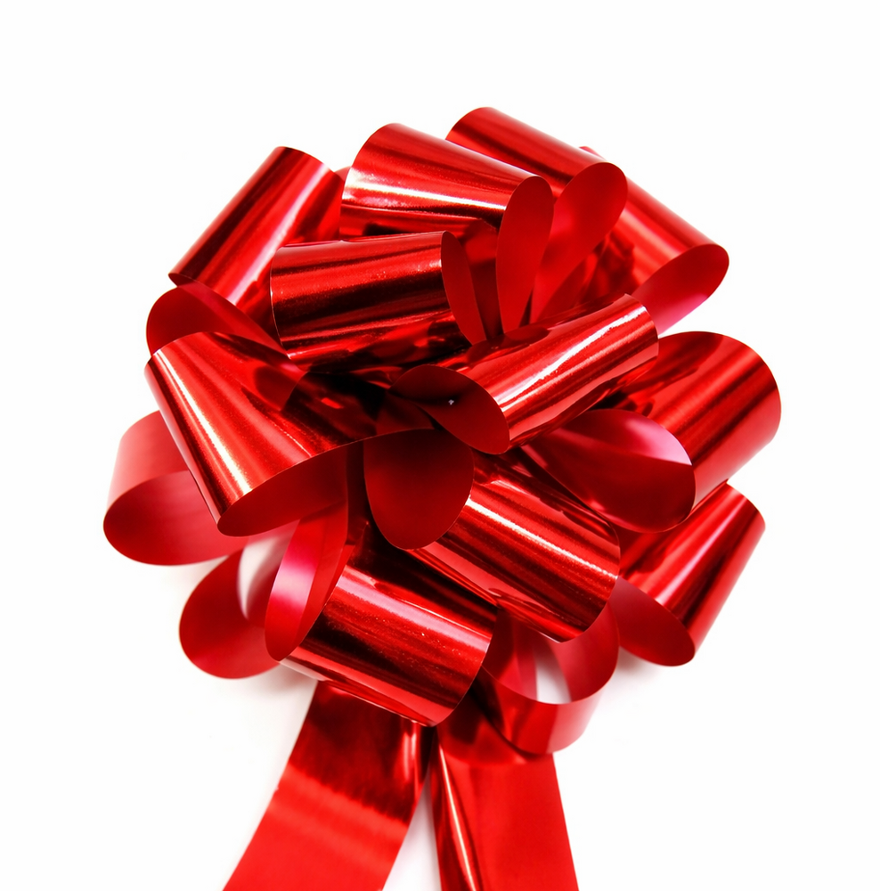 12 x Pull String Pom Pom Bows - Metallic Red Gift Bow