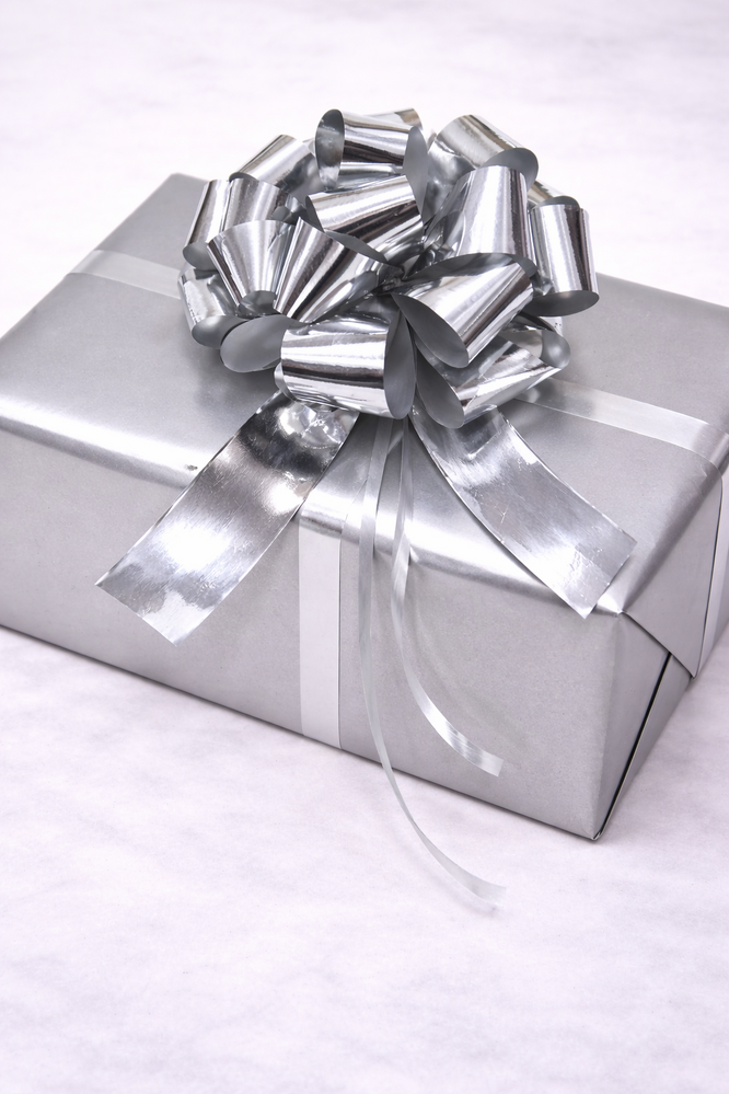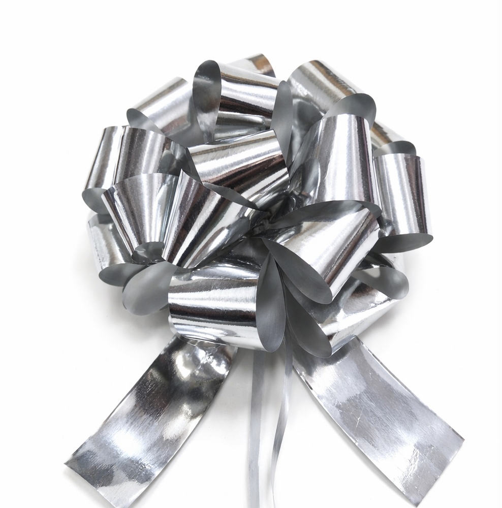 12 x Pull String Pom Pom Bows - Metallic Silver Gift Bow