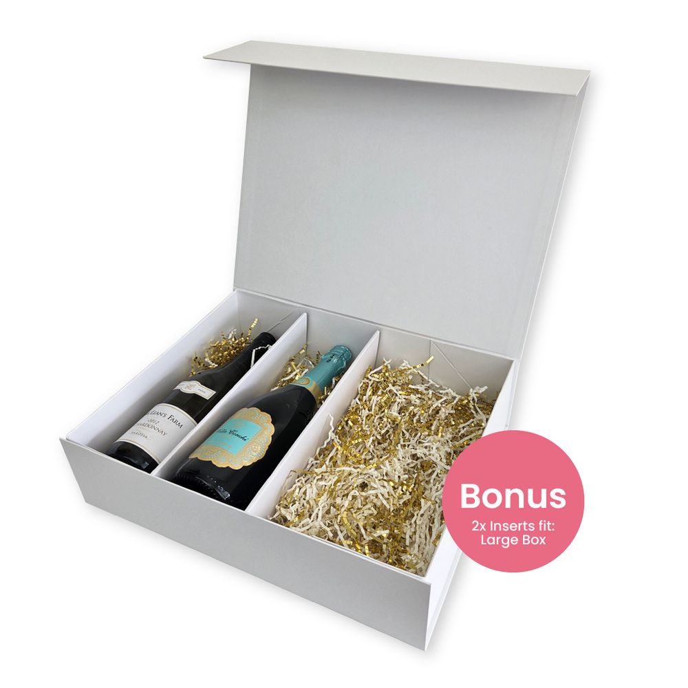 Added Bonus: These double wine bottle inserts are also compatible with our Large White Magnetic Gift Boxes, allowing you to repurpose them for alternate gifting options!