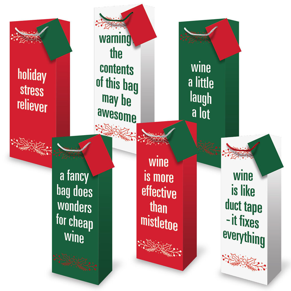 A nice selection of Christmas bottle bags which come in an assortment of cheeky designs printed on the bags that will sure lighten up the Christmas spirit. Also comes with a gloss laminated finish and beautiful rope handles!