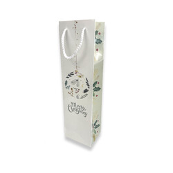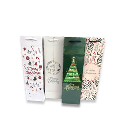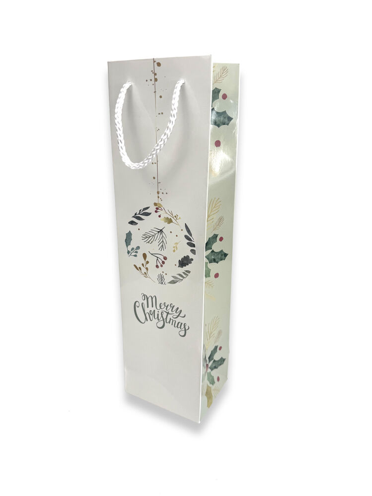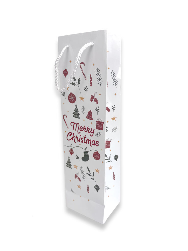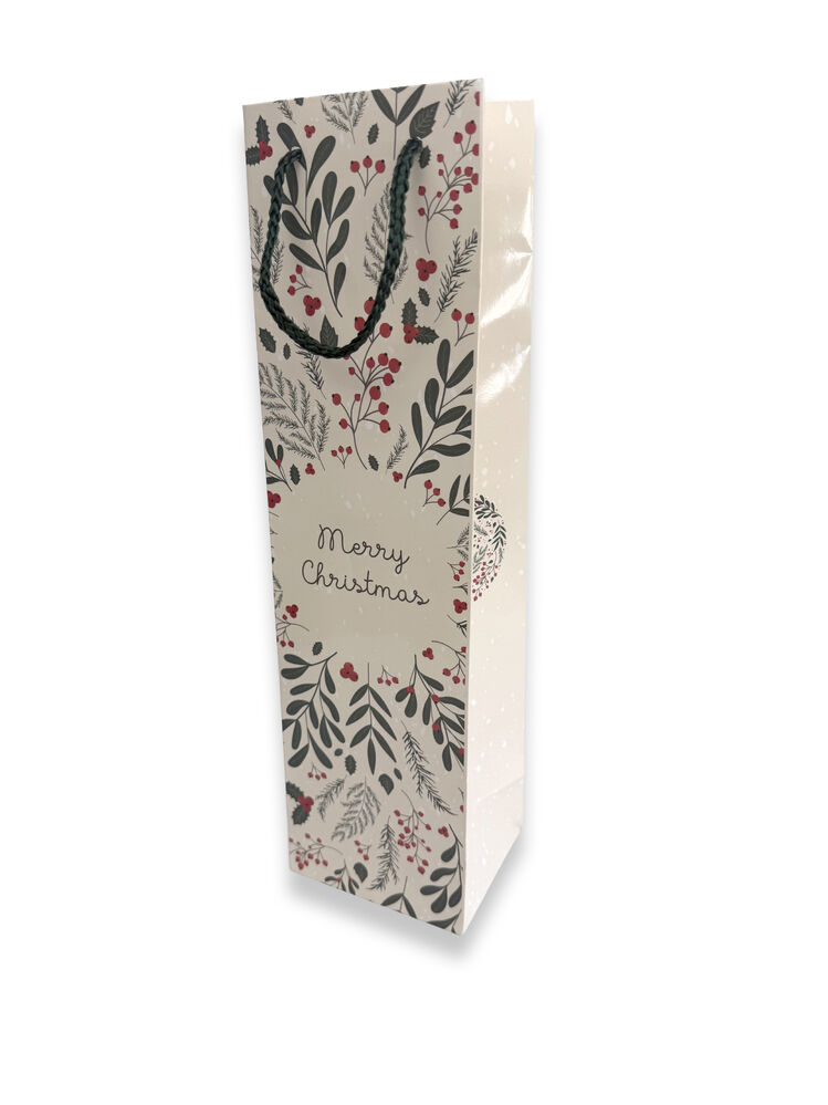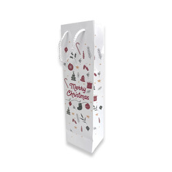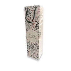 A nice selection of Christmas bottle bags which come in an assortment of Merry Christmas designs printed on the bags that will sure lighten up the Christmas spirit. Also comes with a gloss laminated finish and beautiful rope handles! This Christmas print is designed & illustrated by Gift Packaging & Accessories.