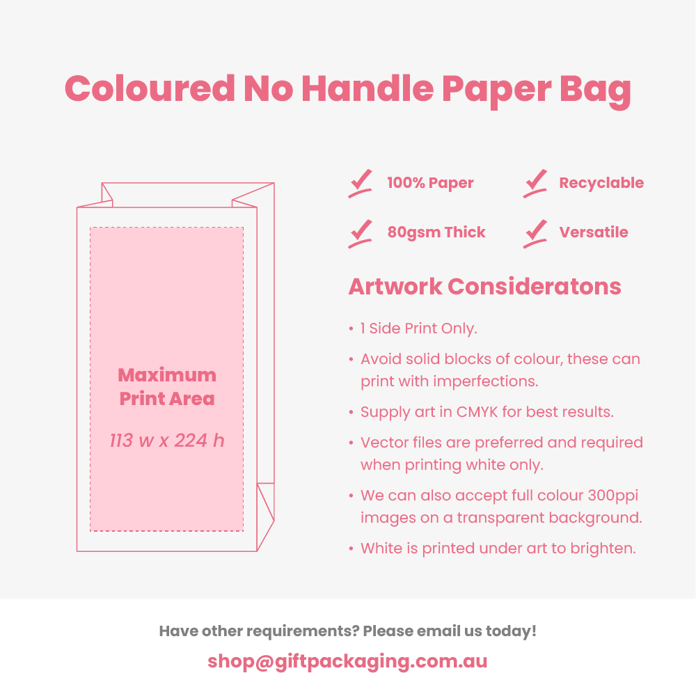 Please reply to your order confirmation or email shop@giftpackaging.com.au and we will return to you with a digital proof to approve before we can produce your order.Please supply a Vector artwork file or 300ppi resolution on transparent background for all other image types. We can assist with minor artwork editing, however, complex editing may incur an artwork fee.