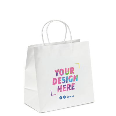 Custom Printed & Personalised Delivery White Kraft Gift Carry Bags. Minimum order is just 50 bags! Strong versatile kraft bag, great alternative to plastic bags. Each bag comes with matching twisted white kraft paper handles.