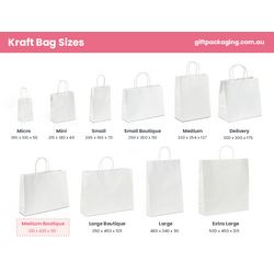 Custom Printed & Personalised Medium Boutique White Kraft Gift Carry Bags. Minimum order is just 50 bags! Strong versatile kraft bag, great alternative to plastic bags. Each bag comes with matching twisted white kraft paper handles.