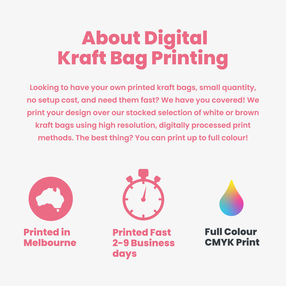 We print over our ready-made kraft bags one by one, by hand which is why there are limitations to the print area and maximum print size. There can be variations in print alignment between each bag due to the manual nature of printing.