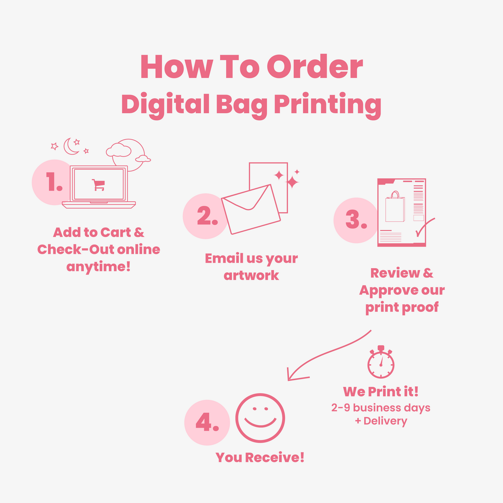 Please reply to your order confirmation or email shop@giftpackaging.com.au and we will return to you with a digital proof to approve before we can produce your order.Please supply a Vector artwork file or 300ppi resolution at actual size for all other image types (Otherwise you may risk reduced print quality). We can assist with minor artwork editing, however, complex editing may incur an artwork fee.