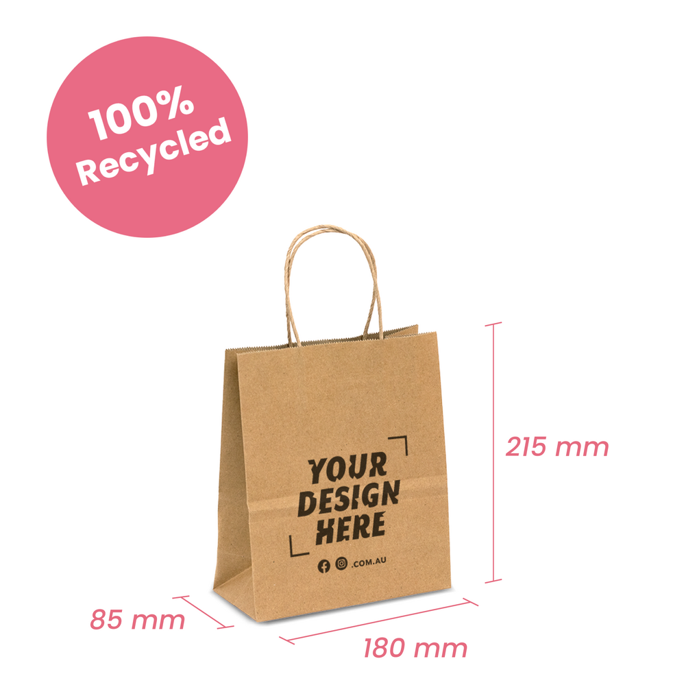 Custom Printed & Personalised 100% Recycled Mini Brown Kraft Gift Carry Bags. Minimum order is just 50 bags! Versatile kraft bag, great alternative to plastic bags for your lighter items. Each bag comes with matching twisted brown kraft paper handles.