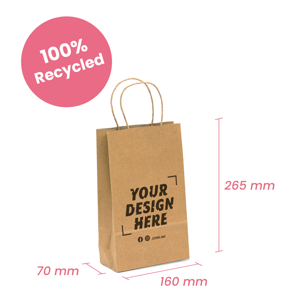 Custom Printed & Personalised 100% Recycled Small Brown Kraft Gift Carry Bags. Minimum order is just 50 bags! Versatile kraft bag, great alternative to plastic bags for your lighter items. Each bag comes with matching twisted brown kraft paper handles.