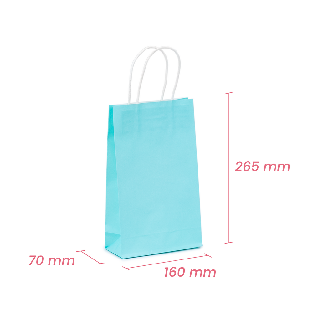 Our White Kraft Paper Gift Bag comes with a light blue exterior colour with sturdy twisted white kraft paper handles for easy carrying purposes. They measure 265mm(h) x 160mm(w) x 70mm(gusset) at 120gsm. They're a strong versatile kraft paper gift bag and are a great alternative to plastic bags. These bags are recyclable, perfect for our eco-conscious customers. Purchase in bulk to get the best prices on our wholesale paper bags, be sure to set up a wholesale account when ordering 1000 or more!