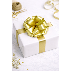 Pre-Made Matt Metallic Gold Pom Pom Bow. Each gift bow comes pre-attached to a hangsell for quick and easy presentation in your store or easy organisation at home. These bows come to you already made (Unlike our pull-string pom pom bows) so they are ready to adhere to your gifts!