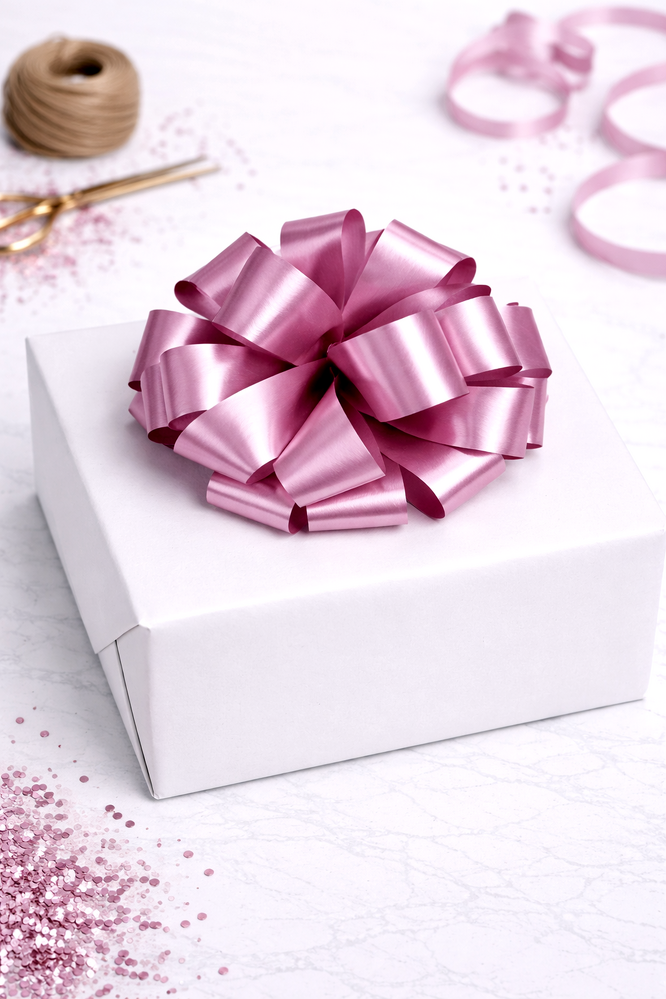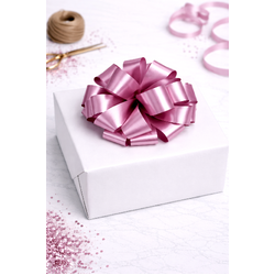 Pre-Made Matt Metallic Light Pink Pom Pom Bow. Each gift bow comes pre-attached to a hangsell for quick and easy presentation in your store or easy organisation at home. These bows come to you already made (Unlike our pull-string pom pom bows) so they are ready to adhere to your gifts!