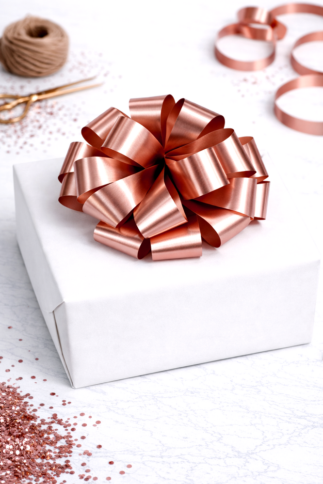 Pre-Made Matt Metallic Rose Gold Pom Pom Bow. Each gift bow comes pre-attached to a hangsell for quick and easy presentation in your store or easy organisation at home. These bows come to you already made (Unlike our pull-string pom pom bows) so they are ready to adhere to your gifts!