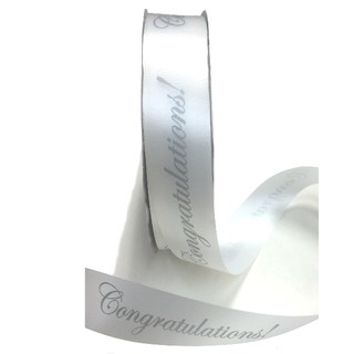 30mm x 91M Roll of Printed Florist Tear Ribbon. White background with silver 'Congratulations!' written on one side of the ribbon. Great for engagements or weddings.