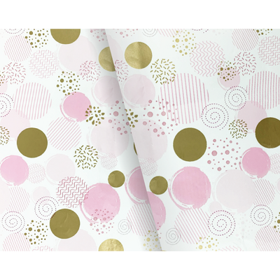 This design comes in an arrangement of circles in various patterns and sizes, from spirals and bold stripes, to dots and wavy lines creating quite the visual effect! The contrast of the soft pink and beautiful metallic gold sure makes a statement! Ideal for birthdays, baby showers, bridal gifts, or any special occasion that calls for something a little extra pretty!
