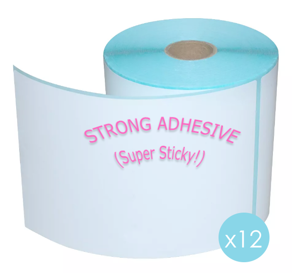 Strong Adhesive (“Super Sticky”) Direct Thermal Shipping Labels 100mm x 150mm (4x6) – 500 Labels per Roll – Pack of 12