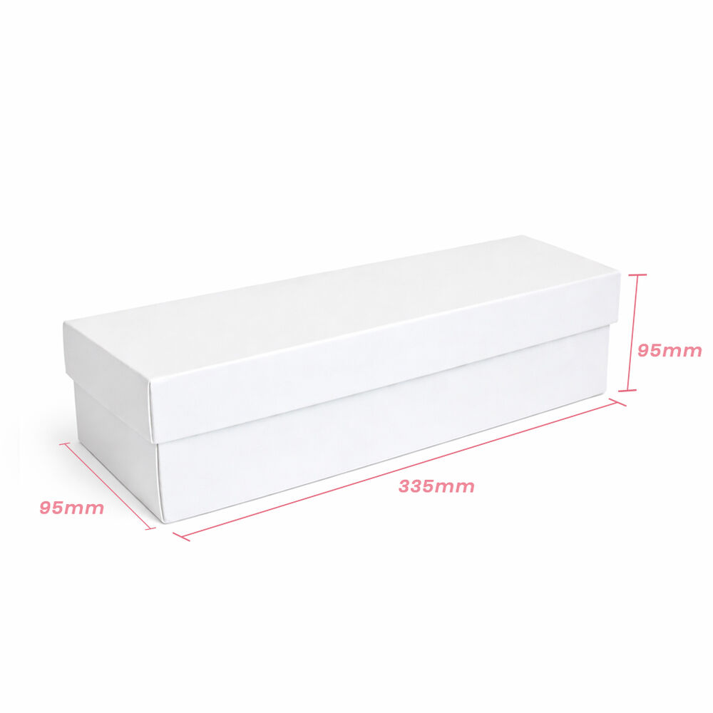 Our White Single Bottle Gift Box is a classic, clean and professional packaging solution designed to complement any gift or product presentation. Made from durable 300gsm paperboard and finished with a smooth gloss varnish, this two-piece white gift box includes a separate base and lid for a premium, modern unboxing experience. Measuring 335mm(l) x 95mm(w) x 95mm(d), this size is ideal for housing a single wine or champagne bottle! It also makes it perfect for long, delicate items, offering a neat and beautiful presentation.